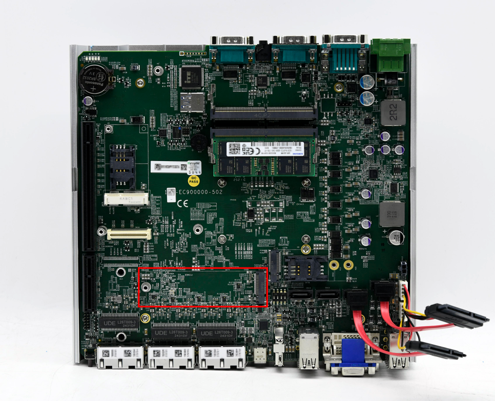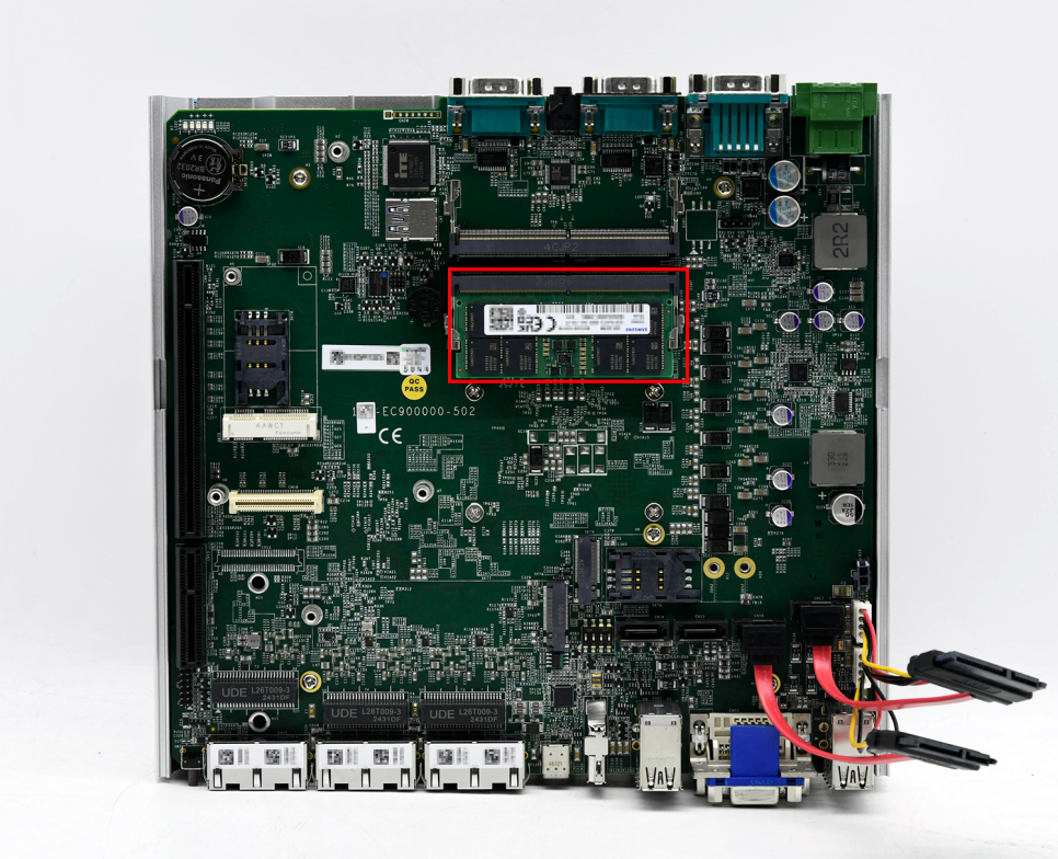 Nuvo-9006DE-POE는 DDR5 SO-DIMM 소켓(빨간색으로 표시)을 제공하여 한 슬롯에 최대 32GB까지 장착할 수 있습니다. 이번엔 고객사의 요청으로 DDR5 16GB SO-DIMM 1개가 장착되었습니다.