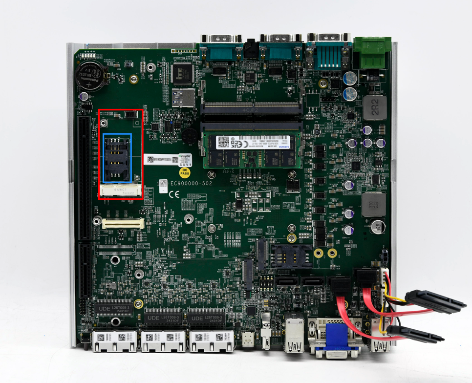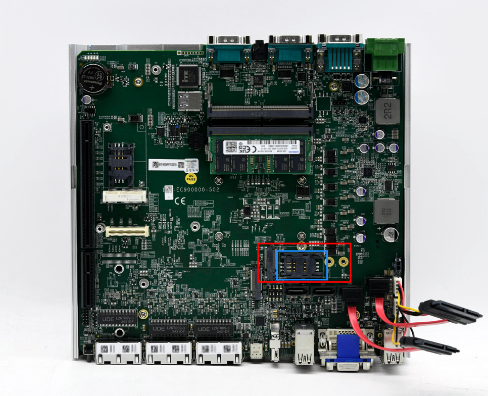 Nuvo-9006DE-POE는 5G/4G SIM 슬롯(파란색으로 표시)이 있는 M.2 2242/ 3042/ 3052 슬롯(빨간색으로 표시)이 있습니다. 5G 또는 4G M.2 모듈과 SIM 카드를 설치하면 공급자의 네트워크를 통해 인터넷에 액세스할 수 있습니다.