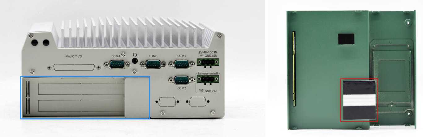 Nuvo-9006DE-POE의 외관에는 슬롯이 있는 특허 받은 카세트(파란색으로 표시)가 있어 CPU와 카드 간의 열 영향을 차단합니다. 특허받은 카세트 설계는 흡입한 공기를 유도하여 카드로 흐르도록 분리된 터널을 형성합니다. 카세트에는 2개의 PCIe x16 슬롯이 있습니다.