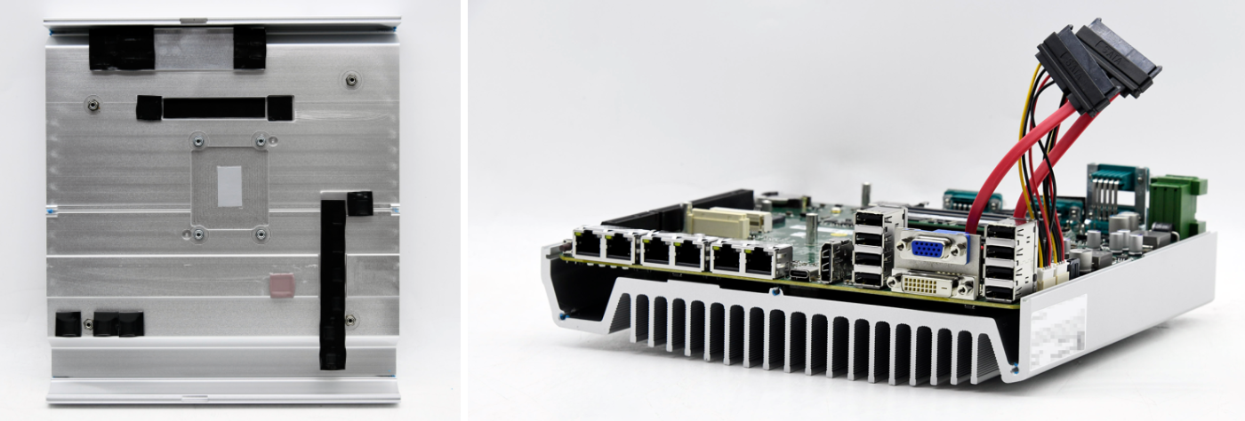 Nuvo-9006DE-POE는 팬리스 타입으로 히트싱크가 장착되며, 기본으로 CPU와 메인보드에 장착된 칩의 열전도 방지를 위해 서멀패드(방열패드)가 부착되어 있습니다. 비맥스테크놀로지에서 취급하고 있는 팬리스PC의 특징으로 열이 발생하는 구성 요소(CPU, PCH, GbE, Power Choke 등)를 히트싱크에 직접 닿을 수 있게하여 열 방출이 훨씬 효과적입니다.