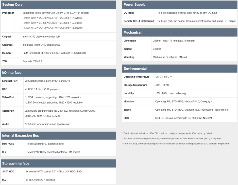 듀얼 LAN, 4개의 USB 3.1, 4개의 COM 포트, VGA·DVI-D 영상 출력 등 핵심 연결성을 제공합니다.