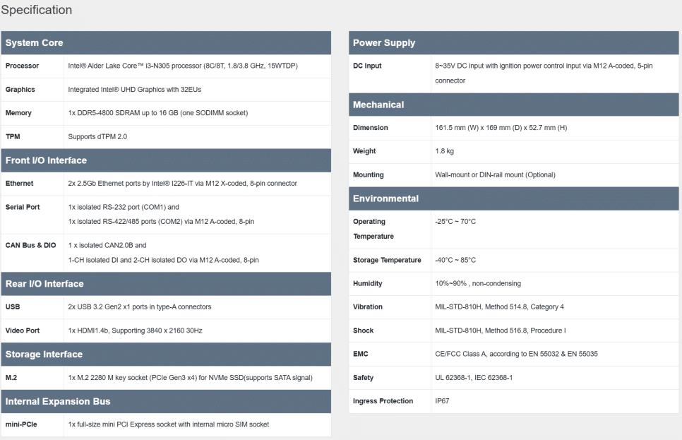 M12 커넥터 기반 I/O 구성과 절연 CAN, 절연 시리얼, DIO 인터페이스를 제공해 차량, 물류, 스마트 인프라 등 다양한 산업 현장에 적합한 구성을 갖추고 있습니다.