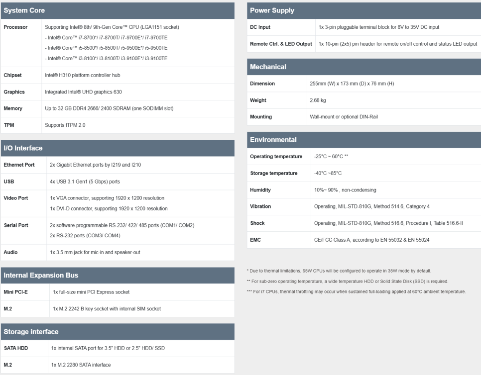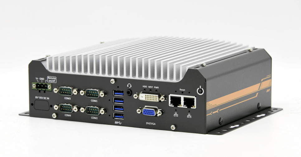 255×173×76mm의 컴팩트 섀시에 필수 입출력 기능을 갖추고, 팬 없이 동작하는 구조로 혹독한 환경에서도 안정성을 유지할 수 있습니다. -25°C에서 60°C까지의 작동 온도 범위와 8~35V DC 전원 입력을 지원해 제어반, 검사 장비, 이동형 플랫폼에 적합한 모델입니다.