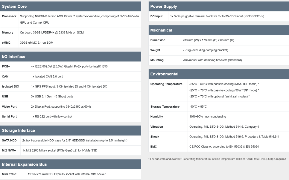 팬리스 동작 온도 옵션: 패시브쿨링 30W TDP 모드 (팬 키트 사용 시 -25~70°C).