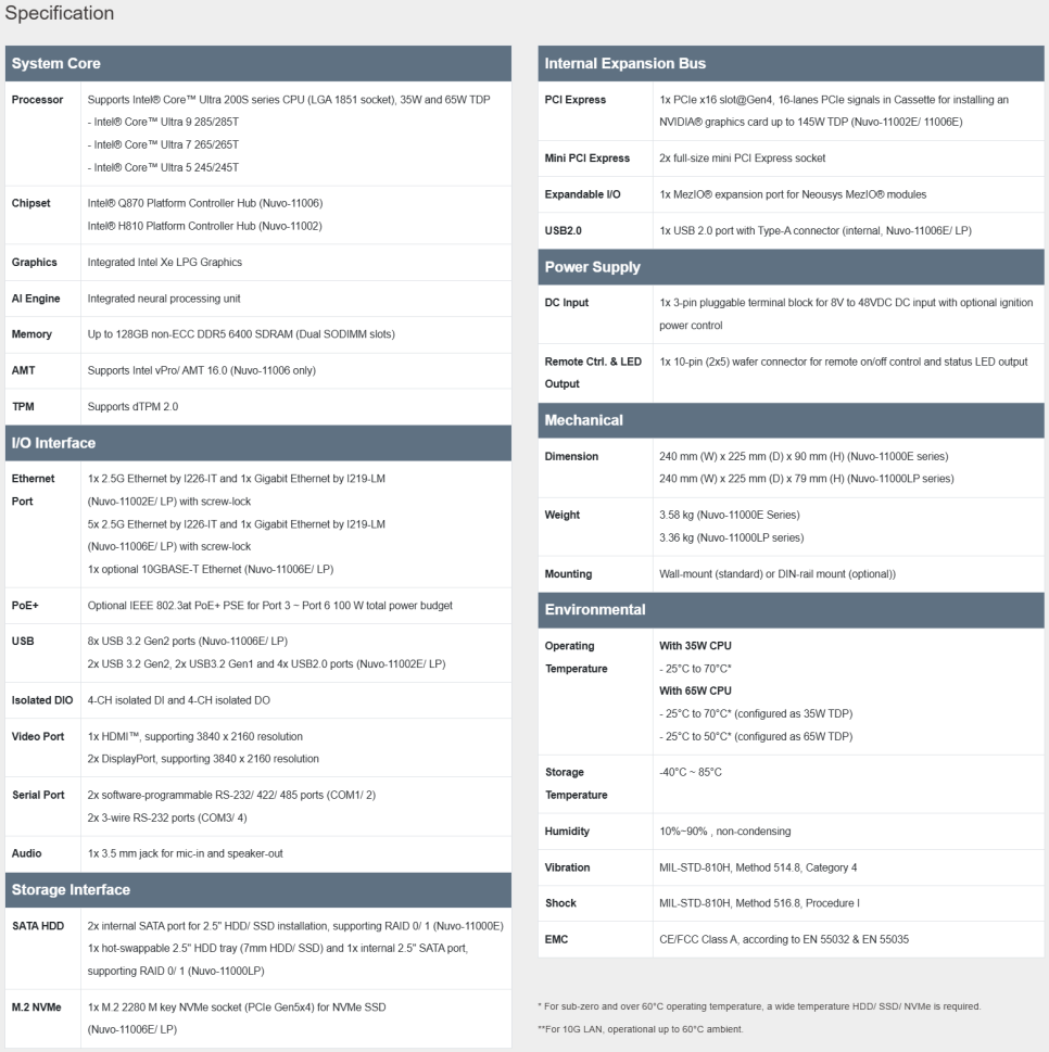 오늘은 Intel® Core™ Ultra 200S 시리즈 프로세서를 지원하며, AI 처리 성능과 확장성, 산업 환경 안정성을 모두 갖춘 Neousys의 Nuvo-11000 Series를 소개드립니다.