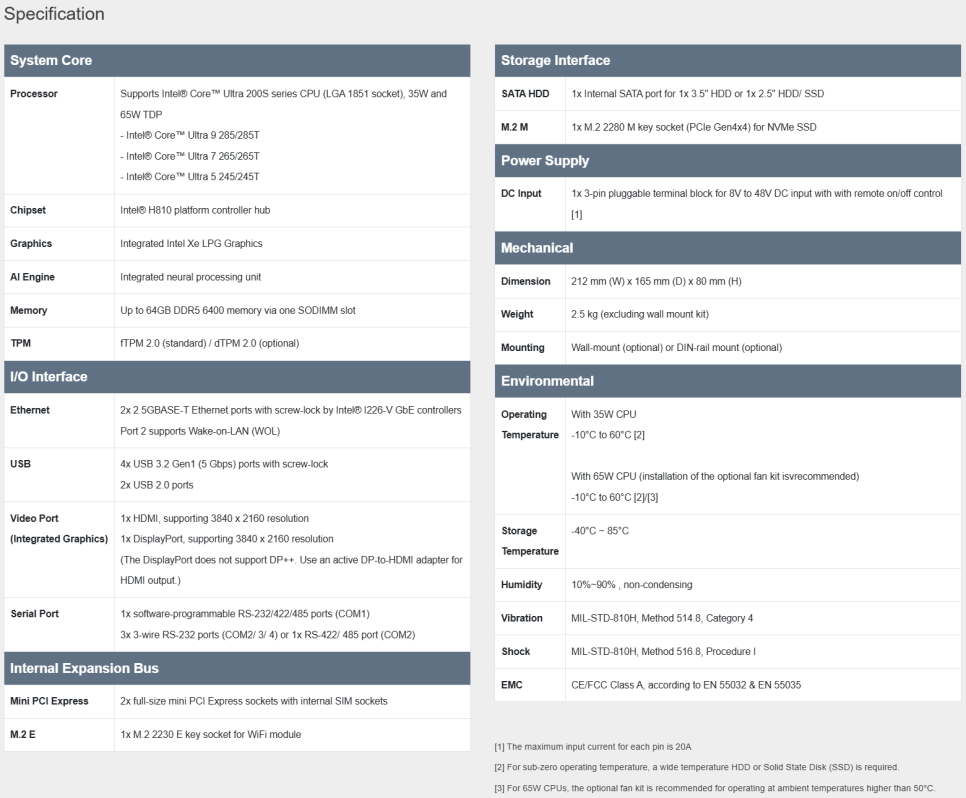 Intel Core Ultra 200S 시리즈 지원 (LGA1851): 35W / 65W TDP 프로세서를 지원하여 성능과 발열 요구사항에 따라 유연한 시스템 구성이 가능합니다.