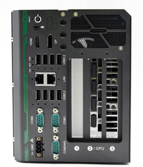 Nuvo-10003은 USB 카메라 연결을 위해 스크류-락 설계를 채용한 USB 3.2 포트 8개를 갖추고 있습니다. 1개의 GbE, 1개의 2.5 GbE, 5개의 COM 포트가 있으며 데이터 저장을 위해 2개의 2.5" HDD/SSD를 수용하는 베이와 1개의 M.2 SATA 슬롯이 있습니다. 또한 Nuvo-10003은 TDP 115W NVIDIA® GPU를 지원하여 최신 딥 러닝 애플리케이션에 필요한 AI 컴퓨팅 성능을 제공할 수 있습니다.