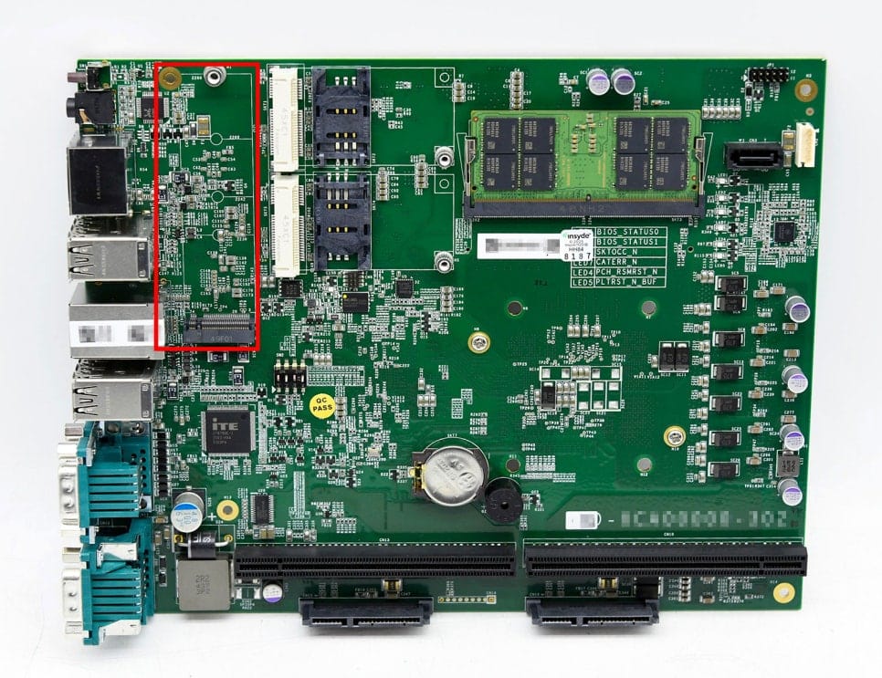 Nuvo-10003은 4G/5G 모듈을 설치하기 위한 미니 SIM 소켓(빨간색으로 표시)과 결합된 2개의 mPCIe 슬롯(파란색으로 표시)이 있습니다.