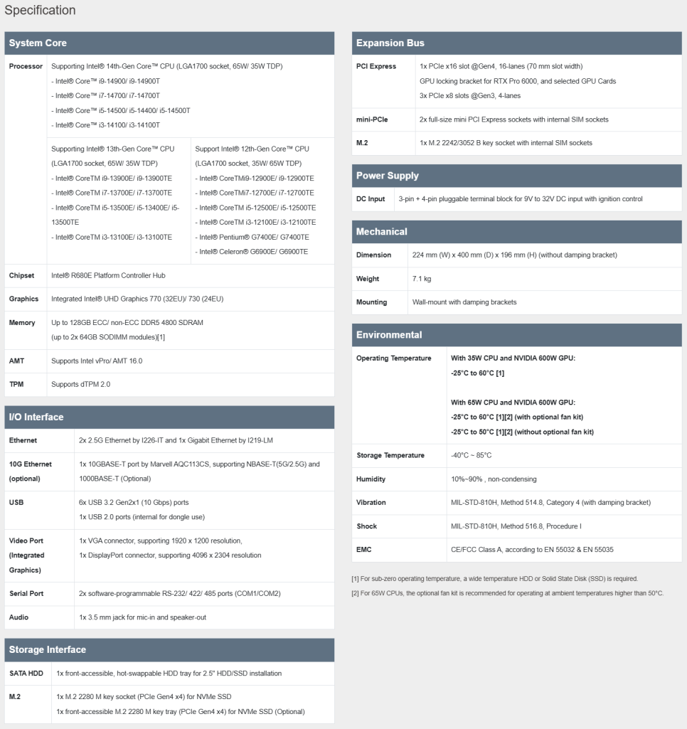 Nuvo-10109GC는 Intel® 14세대 Core™ 프로세서 지원과 함께 PCIe Gen4 x16 슬롯을 통해 RTX Pro 6000급 GPU 확장이 가능한 러기드 산업용 컴퓨터로, 고성능 연산과 장시간 안정 동작이 요구되는 환경에 적합한 플랫폼입니다.