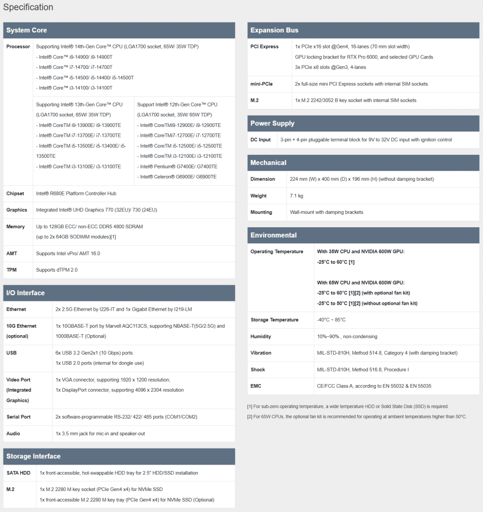 Intel® 14세대 Core™ 프로세서 지원: LGA1700 소켓 기반으로 14·13·12세대 Core™ CPU 지원, 35W / 65W TDP 구성 대응
