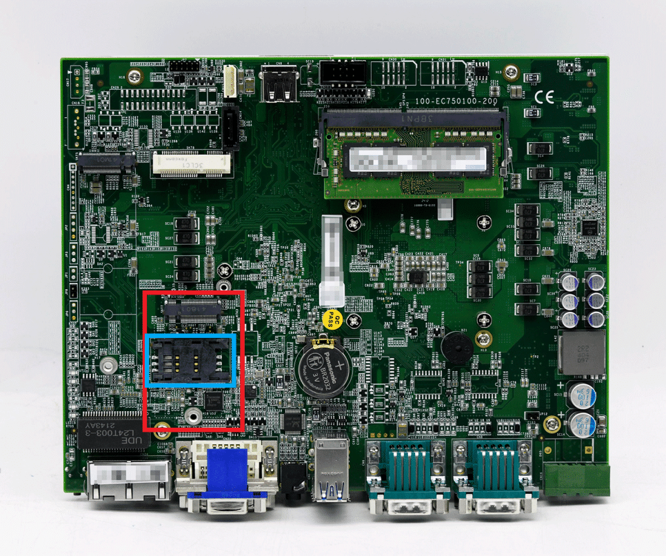 Nuvo-7501은 mini-PCIe 소켓(빨간색으로 표시)을 제공합니다. mini-PCIe 소켓은 SIM 카드(파란색으로 표시)를 지원하도록 설계되었습니다. SIM 카드가 설치되어 있으면 시스템에서 3G/4G 네트워크를 통해 인터넷에 액세스 할 수 있습니다.